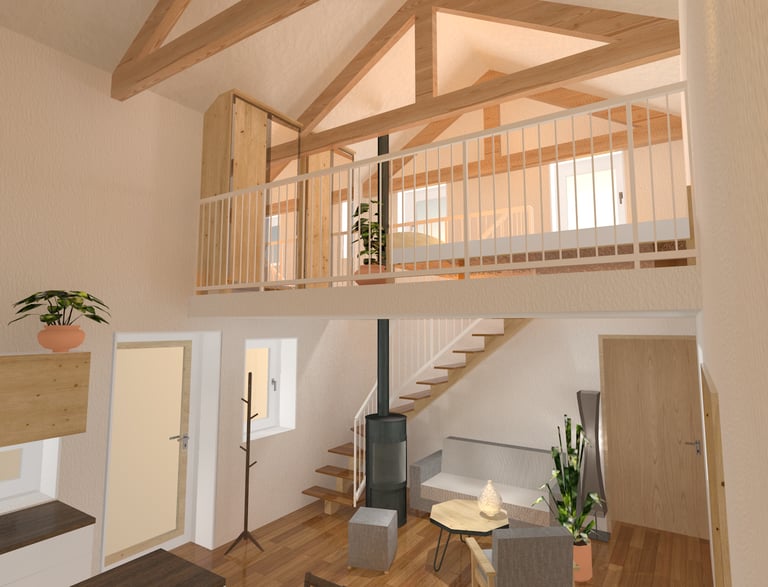 Au rez-de-chaussée se trouvent les espaces de vie : la cuisine, le salon, la salle à manger et les salles d'eau. À l'étage, une mezzanine comme espace de nuit.